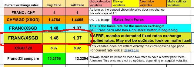 2) big amounts may push the price above or below peg on zilswap because of slippage, you may get better price at fixed rate on MamboSwap. If you want to sell big amount of Franc on Mamboswap, check the zUSDT or XSGD funds available first!