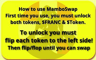 $FRANC is Mamboswap's basic currency and trades vs $XSGD, $zUSDT and all of our own stablecoins